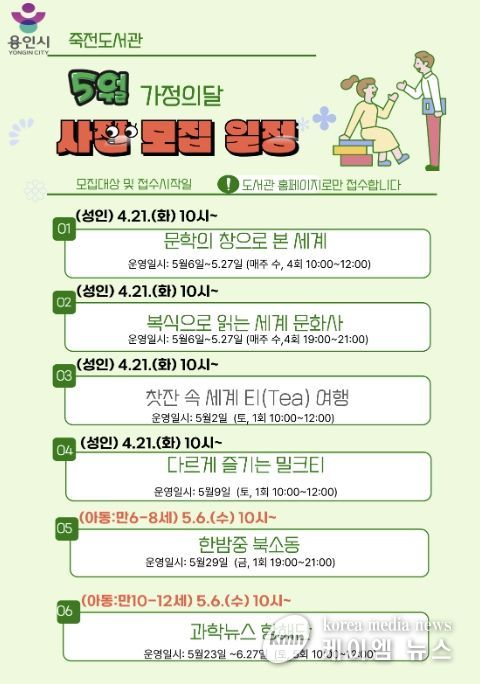 (케이엠뉴스) 용인특례시 죽전도서관은 오는 5월 가정의 달을 맞아 ‘2026년 5월 독서문화행사’를 개최한다.