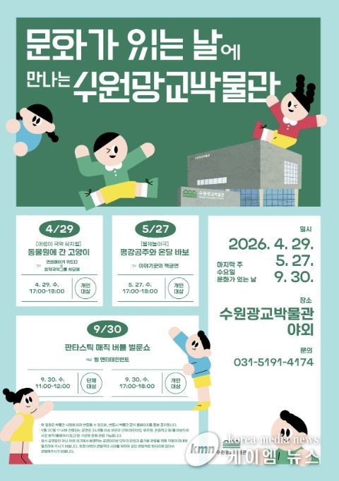 (케이엠뉴스) 수원광교박물관은 4·5·9월 ‘문화가 있는 날’(매달 마지막 주 수요일)에 박물관 야외에서 어린이와 가족 관람객을 위한 무료 공연을 연다.