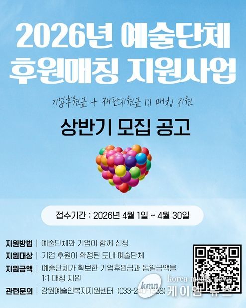 (케이엠뉴스) 강원문화재단은 도내 예술단체의 안정적인 창작기반 마련과 기업의 문화예술 후원 참여 확대를 위해 '2026년 예술단체 후원매칭 지원사업' 상반기 공모를 추진한다.