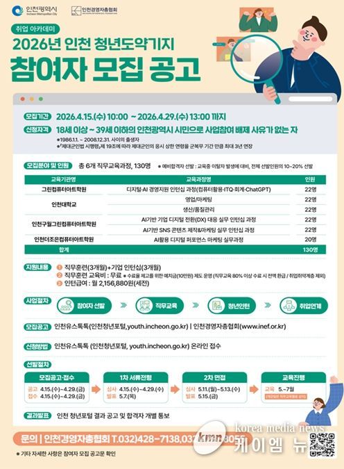 (케이엠뉴스) 인천광역시는 청년의 취업역량을 강화하고 지역기업이 필요로 하는 실무형 인재를 양성하기 위해 ‘2026 인천 청년도약기지’ 사업 참여자 130명을 4월 15일부터 4월 29일까지 모집한다고 밝혔다.