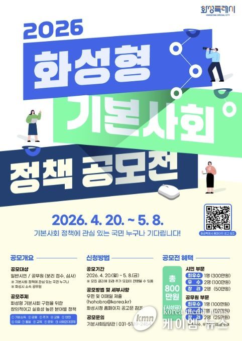 (케이엠뉴스) 화성특례시는 시민 참여 기반을 확대하고, 실효성 있는 기본사회 정책을 발굴하기 위해 '2026년 화성형 기본사회 정책 공모전'을 개최한다고 밝혔다.