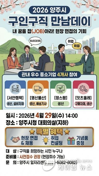 행사는 오는 4월 29일 오후 2시부터 4시까지 양주시청 대회의실에서 진행되며, 구직자는 사전 신청 또는 행사 당일 오후 1시 30분부터 현장 접수 후 면접에 참여할 수 있다. 참여를 희망하는 구직자는 이력서 등 지원 서류를 지참해야 한다.