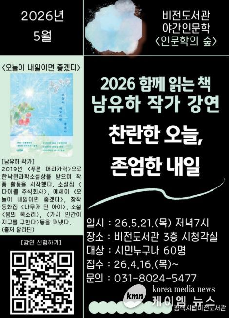 (케이엠뉴스) 평택시립 비전도서관은 오는 5월 21일 저녁 7시 남유하 작가를 초청하여 ‘찬란한 오늘, 존엄한 내일’을 주제로 야간 인문학 강연을 진행한다.