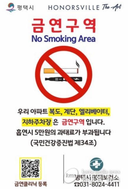 (케이엠뉴스) 평택시가 시민의 건강권을 보호하고 담배 연기 없는 쾌적한 주거환경을 조성하기 위해 지난 3월 10일, 통복동 소재 ‘평택역 경남아너스빌 디아트’를 평택시 제45호 공동주택 금연구역(금연아파트)으로 지정했다고 밝혔다.