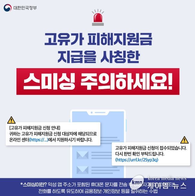 (케이엠뉴스) 안성시가 오는 27일부터 신청하는 ‘고유가 피해지원금’ 신청을 앞두고 정부 및 지자체 등을 사칭한 스미싱 등 금융 사기에 대해 시민들의 각별한 유의를 당부했다. 시는 특히 공식 알림 서비스인 ‘국민비서’를 적극 활용해 사기 피해를 예방할 것을 권고했다.