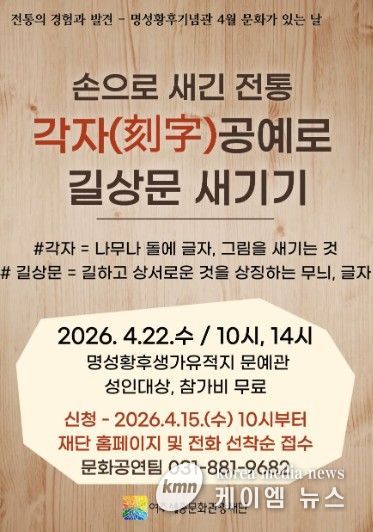 (케이엠뉴스) 여주세종문화관광재단은 오는 4월 22일, 명성황후기념관 4월 문화가 있는 날 프로그램으로 '손으로 새긴 전통, 각자(刻字)공예로 길상문 새기기'를 진행한다.