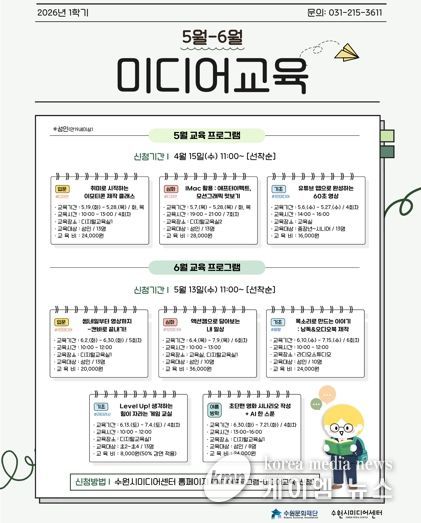또한, 학기제 교육 프로그램으로는 5월 ▲취미로 시작하는 이모티콘 제작 클래스 ▲IMac 활용 : 애프터이펙트, 모션그래픽 맛보기 등 디자인 중심 교육이 개설되며, 6월에는 ▲썸네일부터 영상까지 캔바로 끝내기! ▲액션캠으로 담아보는 내 일상 등 1인 미디어를 주제로 한 교육을 개설한다. 월별 프로그램 접수일과 프로그램별 수강료가 상이하므로 사전 확인이 필요하다. 미디어 교육 프로그램에 관한 상세 정보 및 교육 신청은 수원시미디어센터 홈페이지를 통해 확인할 수 있다.