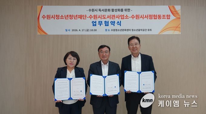 (케이엠뉴스) 수원시청소년청년재단은 수원시도서관사업소, 수원시서점협동조합과 4월 17일 수원청소년문화센터에서 수원시 독서문화 활성화를 위한 업무협약을 체결했다.