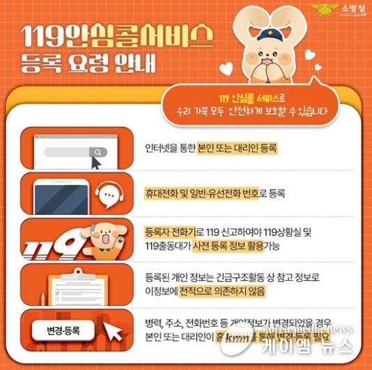 119안심콜서비스는 보호자 연락처, 기저질환, 복용 약물 등 개인의 건강 정보를 사전에 등록하면 119 신고 시 상황실과 구급대원이 해당 정보를 즉시 확인해 보다 적절한 응급처치와 병원 이송을 지원하는 제도다.