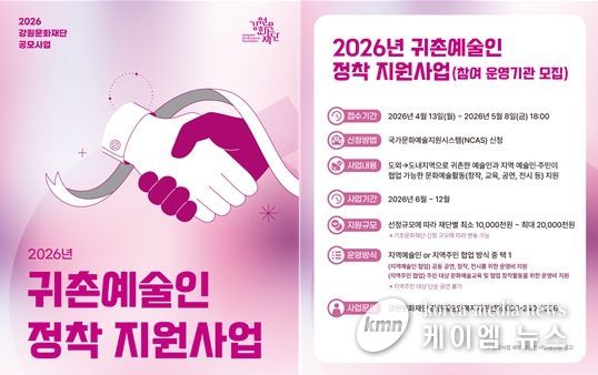 (케이엠뉴스) 강원문화재단은 귀촌예술인의 안정적인 지역 정착과 지역문화 활성화를 위해 '2026년 귀촌예술인 정착 지원사업' 운영기관을 오는 5월 8일까지 공개 모집한다.