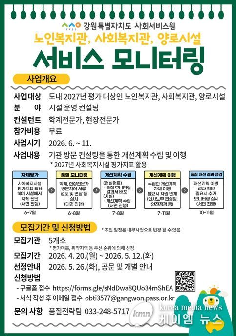 (케이엠뉴스) 강원특별자치도 사회서비스원은 도내 사회복지시설의 서비스 품질 향상과 사회서비스 품질 표준화 체계 구축을 위해 오는 6월부터 ‘서비스 모니터링’ 사업을 추진한다.
