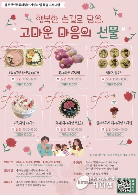 (케이엠뉴스) 홍성군 홍주천년문화체험관은 가정의 달을 맞아 오는 5월 2일부터 3일까지 이틀간 특별 프로그램 “행복한 손길로 담은 고마운 마음의 선물”을 운영한다.