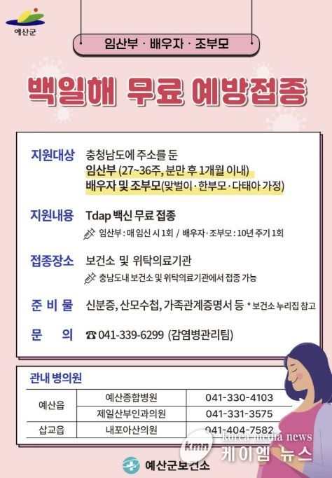(케이엠뉴스) 예산군은 건강한 출산과 양육 환경 조성을 위해 백일해 무료 예방접종 지원 사업을 확대 시행하고 있다.