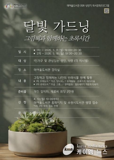 (케이엠뉴스) 수원시 매여울도서관이 그림책 읽기와 식물 가드닝을 결합한 체험형 프로그램 ‘달빛 가드닝, 그림책과 함께하는 초록시간’을 운영한다.