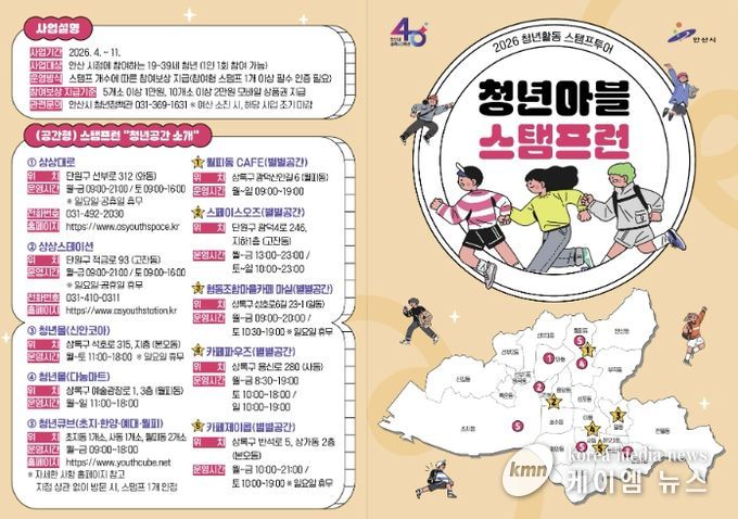 (케이엠뉴스) 안산시는 청년의 시정 참여를 확대하고 청년공간과 정책에 대한 접근성을 높이기 위해 청년활동 스탬프투어 ‘청년마블 스탬프런’ 사업을 운영한다고 20일 밝혔다.