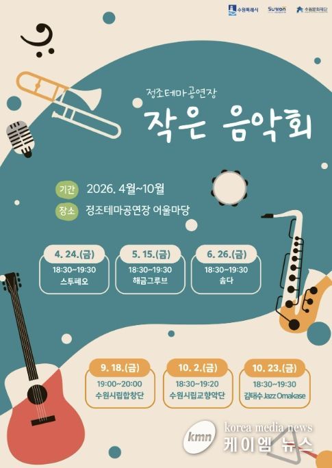 수원문화재단은 오는 24일부터 10월 23일까지 정조테마공연장 어울마당에서 시민 누구나 즐길 수 있는 야외 공연 시리즈 ‘작은 음악회’를 운영한다.