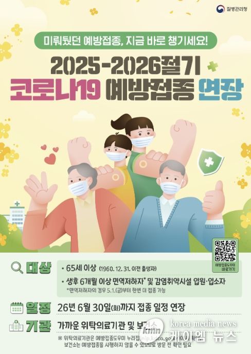 이번 연장 대상은 2025-2026절기 코로나19 미접종자와 기접종자 중 면역저하자다. 특히 면역저하자는 일반인보다 면역 유지 기간이 상대적으로 짧은 점을 고려해 최소 접종 간격 90일을 준수하면 연장 기간인 5월 1일부터 6월 30일까지 1회 추가접종이 가능하다.