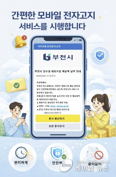 (케이엠뉴스) 부천시는 이달 20일부터 시민 납세 편의를 높이고 고지서 전달의 정확성을 강화하기 위해 세외수입(일반회계) 체납안내문을 카카오톡으로 발송하는 모바일 전자고지 서비스를 시행한다.