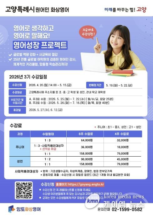 (케이엠뉴스) 고양특례시는 글로벌 역량 강화와 사교육비 부담 완화를 위한 ‘원어민 화상영어’ 프로그램의 3기 수강생을 4월 20일부터 5월 15일까지 모집한다.