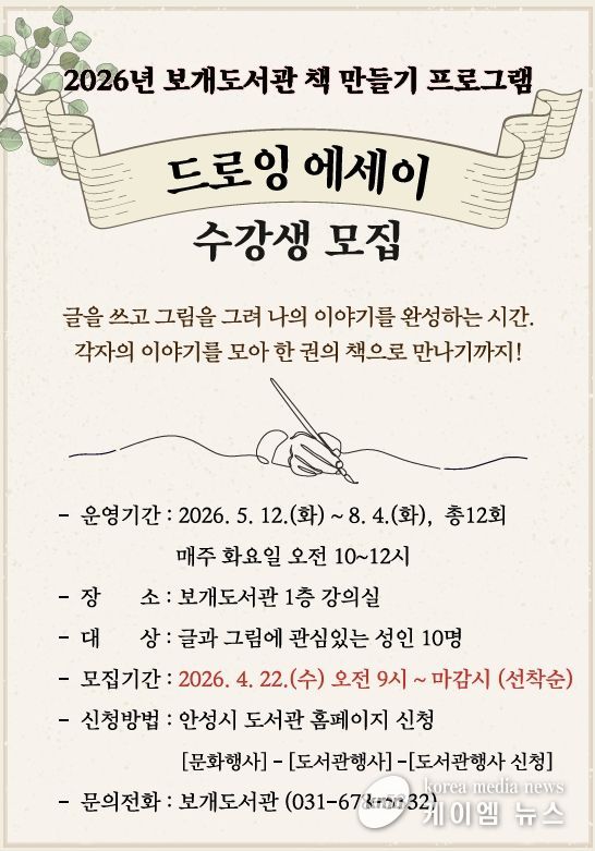 (케이엠뉴스) 안성시 보개도서관(책문화센터)이 시민들의 창작 활동을 지원하고 일상 속 예술 경험을 확대하기 위해 오는 5월부터 ‘드로잉 에세이’와 ‘포토 에세이’ 책 만들기 프로그램을 새롭게 운영한다고 밝혔다.