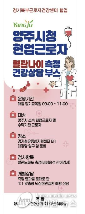 (케이엠뉴스) 양주시가 현업근로자의 건강 증진과 뇌심혈관계질환 예방을 위해 오는 4월 22일부터 연말까지 ‘찾아가는 근로자 건강상담 부스’를 운영한다.