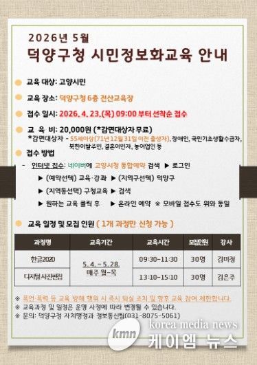 교육은 5월 4일부터 28일까지 덕양구청 전산교육장에서 진행되며, 수강 신청은 4월 23일 오전 9시부터 덕양구청 통합예약 누리집을 통해 온라인으로 접수할 수 있다.