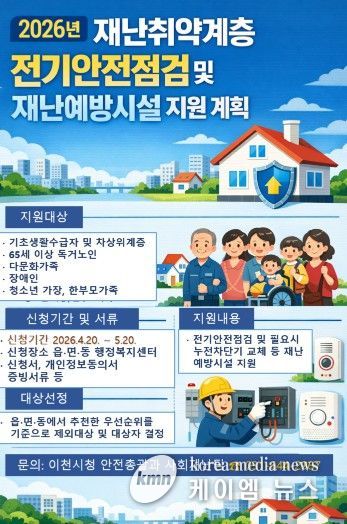 (케이엠뉴스) 이천시는 전기설비 노후화 등으로 인한 화재와 안전사고를 예방하고 재난취약계층의 주거 안전을 강화하기 위해 ‘재난취약계층 전기안전점검 및 재난예방시설 지원사업’을 추진한다고 밝혔다.