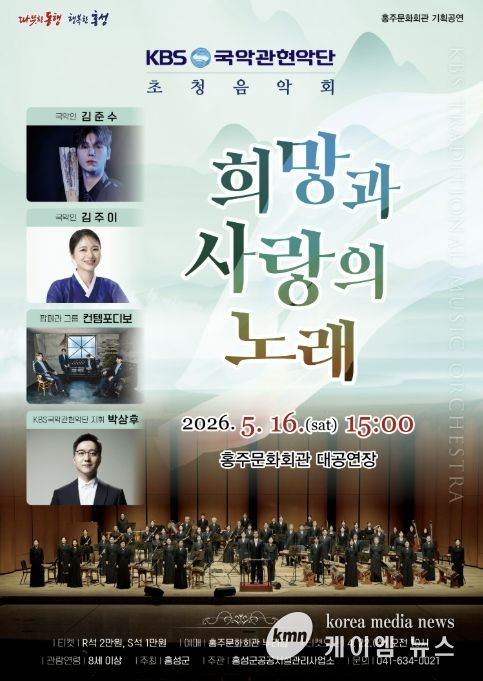 (케이엠뉴스) 홍성군 홍주문화회관은 오는 5월 16일 오후 3시, 가정의 달 특별 기획으로 'KBS국악관현악단 초청음악회 - 희망과 사랑의 노래'를 무대에 올린다.
