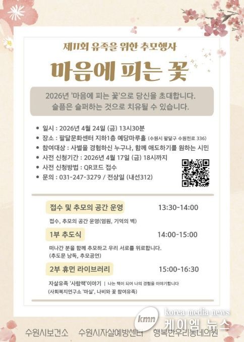 (케이엠뉴스) 수원시자살예방센터가 24일 오후 1시 30분 팔달문화센터 예당마루홀에서 유족을 위한 추모행사 ‘제11회 마음에 피는 꽃’을 연다.