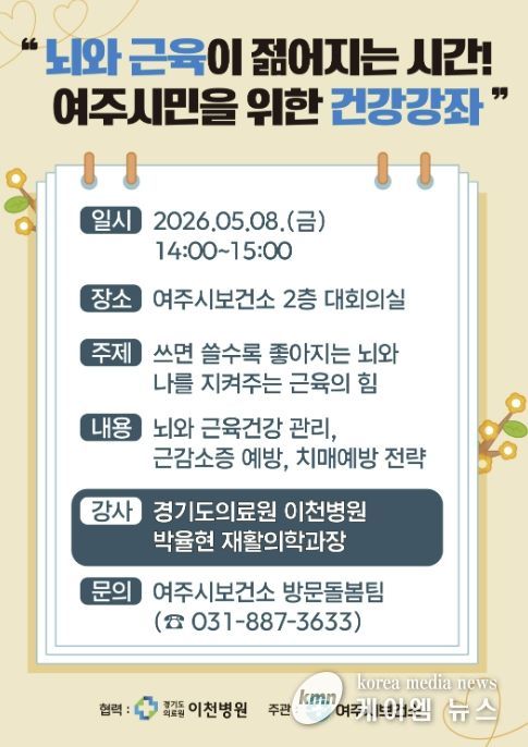 (케이엠뉴스) 여주시보건소 건강증진과는 오는 5월 8일 오후 2시, 보건소 2층 대회의실에서 여주시민을 위한 건강강좌 '뇌와 근육이 젊어지는 시간!'을 개최한다고 밝혔다.