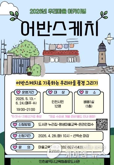 (케이엠뉴스) 인천광역시교육청중앙도서관은 2026년도 마을교육 아카이빙 사업의 일환으로, 5월 13일부터 ‘우리 마을 아카이빙, 어반스케치’ 프로그램을 운영한다.