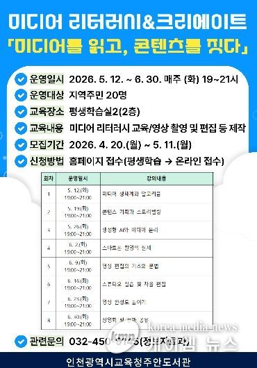 (케이엠뉴스) 인천광역시교육청주안도서관은 시민의 디지털 역량 강화와 올바른 미디어 활용을 돕기 위해, 5월 12일부터 미디어 리터러시 교육 프로그램 ‘미디어를 읽고, 콘텐츠를 짓다’를 운영한다.
