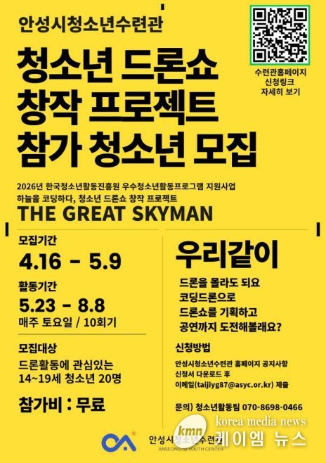 (케이엠뉴스) 안성시청소년수련관은 미래 디지털 인재 양성을 위한 청소년 참여형 프로그램 '하늘을 코딩하다, 청소년 드론쇼 창작 프로젝트 ‘THE GREAT SKYMAN’'에 참여할 청소년을 4월 16일 ~ 5월 8일까지 모집한다고 밝혔다.