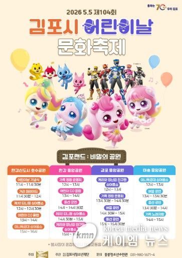 (케이엠뉴스) 오는 5월 5일, 김포 전역이 하나의 거대한 놀이공원이 된다. 김포시는 시가 주최하고 김포시청소년재단에서 주관하는 제104회 어린이날 문화축제가 한강신도시호수공원(마산동), 한강중앙공원(장기동), 걸포중앙공원(걸포동), 마송중앙공원(통진읍)에서 동시 개최된다고 20일 밝혔다.