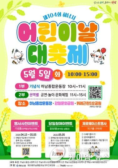 (케이엠뉴스) 하남시는 2026년 제104회 어린이날을 맞아 오는 5월 5일, 어린이와 가족이 함께 즐길 수 있는 ‘제104회 하남시 어린이날 대축제’를 개최한다.