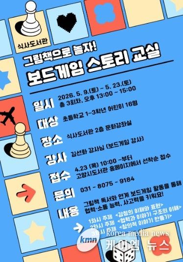 (케이엠뉴스) 고양특례시 식사도서관이 오는 5월 9일부터 공공도서관 독서문화 프로그램 ‘그림책으로 놀자! 보드게임 스토리 교실’을 운영한다.