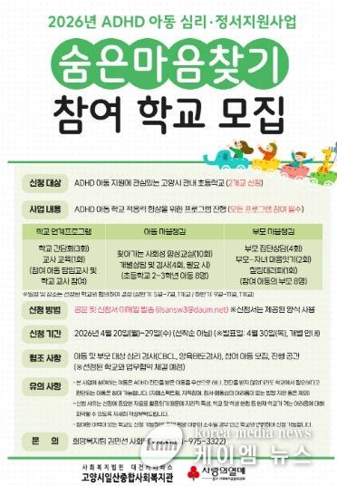 (케이엠뉴스) 고양시일산종합사회복지관은 ADHD 아동의 학교 적응을 돕기 위한 심리·정서지원사업 ‘숨은마음찾기’에 참여할 학교를 모집한다고 21일 밝혔다.