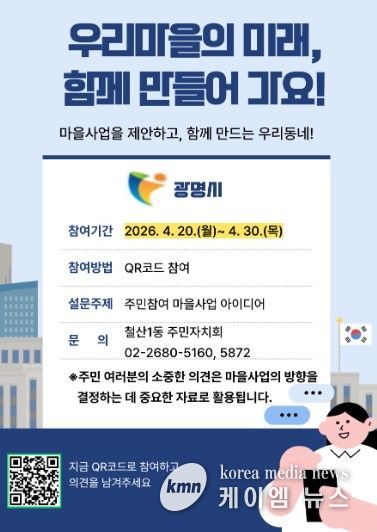 (케이엠뉴스) 광명시 철산1동 주민자치회는 오는 30일까지 철산1동 주민을 대상으로 내년도 주민자치마을사업 발굴을 위한 설문조사를 실시한다.