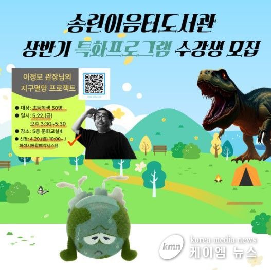 (케이엠뉴스) 화성시문화관광재단 운영 화성시립송린이음터도서관은 상반기 특화프로그램으로 전 과천국립과학관 관장을 역임하고 현재는 과학커뮤니케이터로 과학의 대중화를 위해 애쓰고 있는 이정모 관장을 초청해 5월 22일 오후 3시 30분부터 5시 30분까지 송린이음터(화성시 만세구)에서 환경과 생태의 중요성을 재미있게 풀어내는 '지구멸망 프로젝트' 특강을 운영한다.