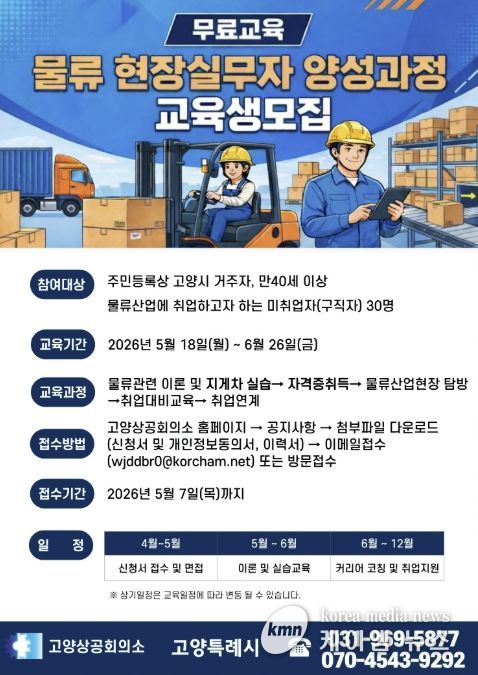 (케이엠뉴스) 고양특례시는 2026년 고양맞춤형 일자리학교 공모에 선정된 ‘물류 현장실무자 양성과정’에 참여할 교육생을 오는 5월 7일까지 모집한다.