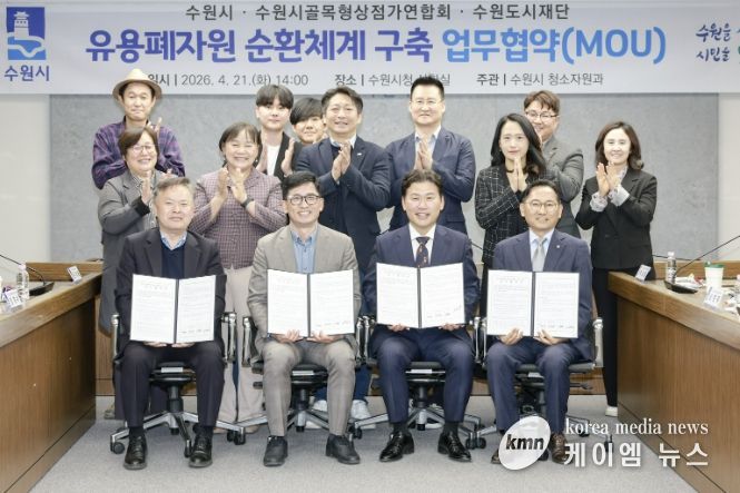 수원시는 21일 시청 상황실에서 수원시골목형상점가연합회, 수원도시공사, 수원도시재단과 ‘유용 폐자원 순환 체계 구축 업무협약’을 체결하고, 협력을 약속했다.