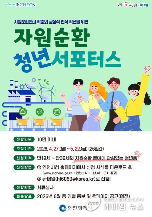 인천시는 자원순환센터 확충에 대한 긍정적 인식을 확산시키고, 실질적인 정책 아이디어를 발굴하기 위해 4월 27일부터 5월 22일까지‘2026 자원순환 청년 서포터스’를 공개 모집한다고 밝혔다.