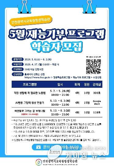 (케이엠뉴스) 인천광역시교육청평생학습관은 오는 27일부터 시민의 재능을 나누는 ‘재능기부 프로그램’ 학습자를 모집한다.