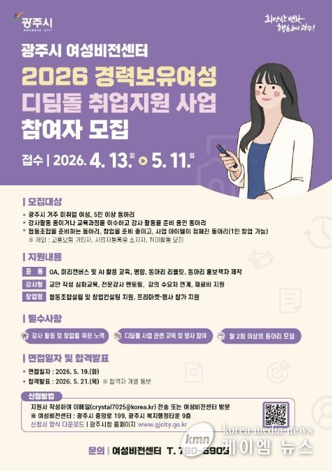(케이엠뉴스) 광주시는 지역 내 경력보유여성의 사회 재진출과 취업 역량 강화를 위해 ‘2026 경력보유여성 디딤돌 취업 지원 사업’ 참여자를 오는 5월 11일까지 모집한다고 22일 밝혔다.