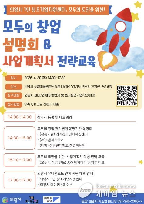 (케이엠뉴스) 의왕시 1인 창조기업지원센터는 4월 30일, 창업을 희망하는 예비 및 초기 창업자를 대상으로 ‘모두의 창업’ 설명회 및 전략 교육을 개최한다.