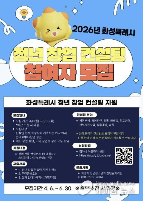 (케이엠뉴스) 화성특례시는 오는 6월 30일까지 ‘2026년 청년 창업 컨설팅 지원사업’ 참여자를 모집한다.