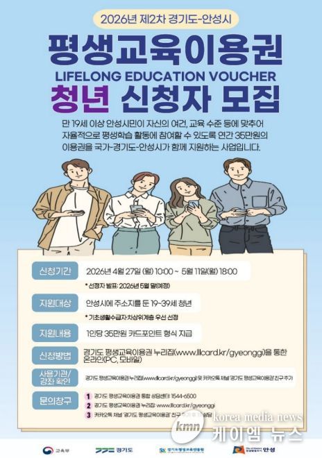 (케이엠뉴스) 안성시는 시민의 평생학습 참여 기회를 두텁게 보장하기 위해 오는 4월 27일 오전 10시부터 5월 11일 오후 6시까지 ‘2026년 제2차 경기도-안성시 평생교육이용권’ 지원 대상자를 모집한다고 밝혔다.