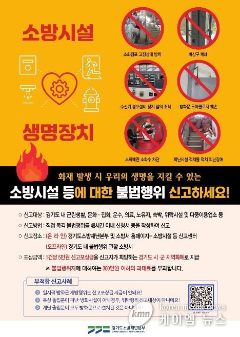 (케이엠뉴스) 남양주소방서는 22일, 화재 발생 시 인명과 재산 피해를 최소화하기 위해 ‘소방시설 등 불법행위 신고포상제’ 홍보에 나선다고 밝혔다.