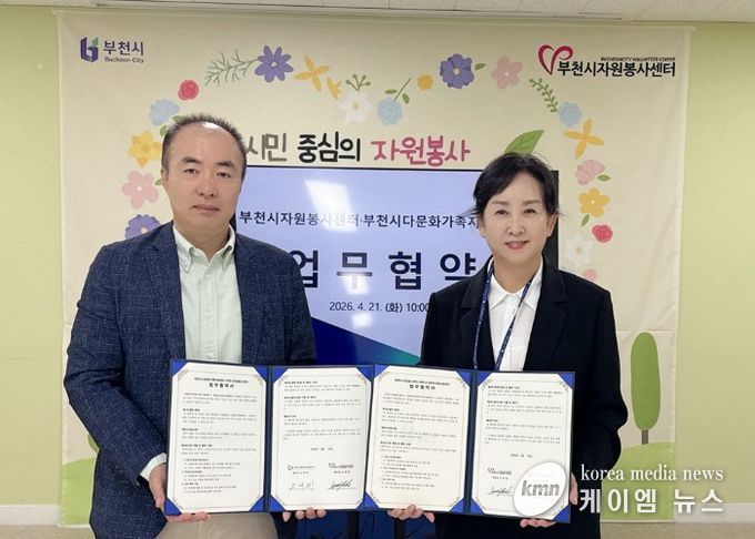 (케이엠뉴스) 부천시다문화가족지원센터는 4월 21일 부천시자원봉사센터와 자원봉사 활성화 및 다문화가족의 지역사회 참여 확대를 위한 업무협약(MOU)을 체결했다고 밝혔다.
