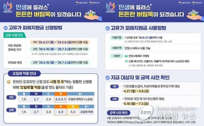 1차 신청 둘째 주(5월 4~8일)에는 출생연도에 관계없이 대상자는 모두 신청할 수 있으며, 주말에는 온라인 신청(카드사 홈페이지·앱·콜센터·ARS, 토스·케이뱅크·카카오뱅크·카카오페이·네이버페이 앱 등)만 가능하다.